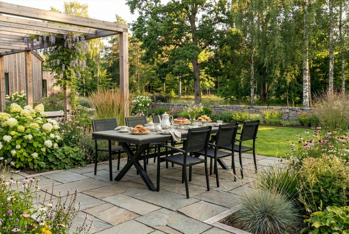 Stilrent matbord tillverkat av svart pulverlackerad aluminium med bords topp av borstad antracitgrå komposit. Designat med trevliga kryssben.