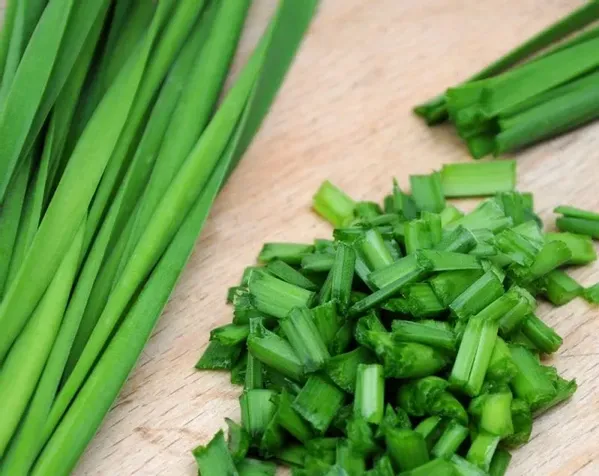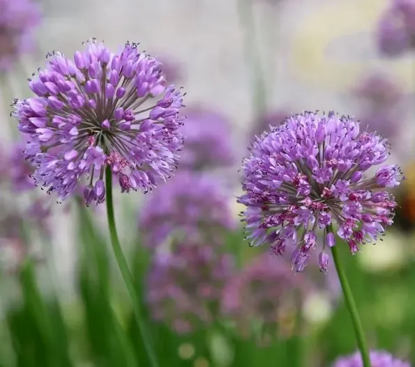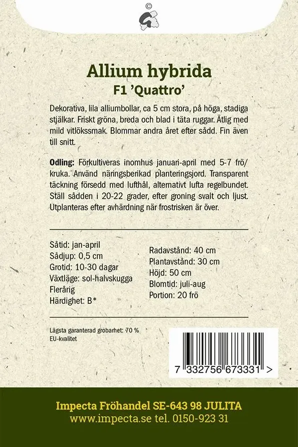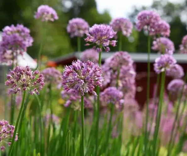 Dekorativa, lila alliumbollar, ca 5 cm stora, på höga, stadiga stjälkar. Friskt gröna, breda blad i täta ruggar. Ätlig med mild vitlökssmak. Blommar andra året efter sådd. Fin även till snitt.