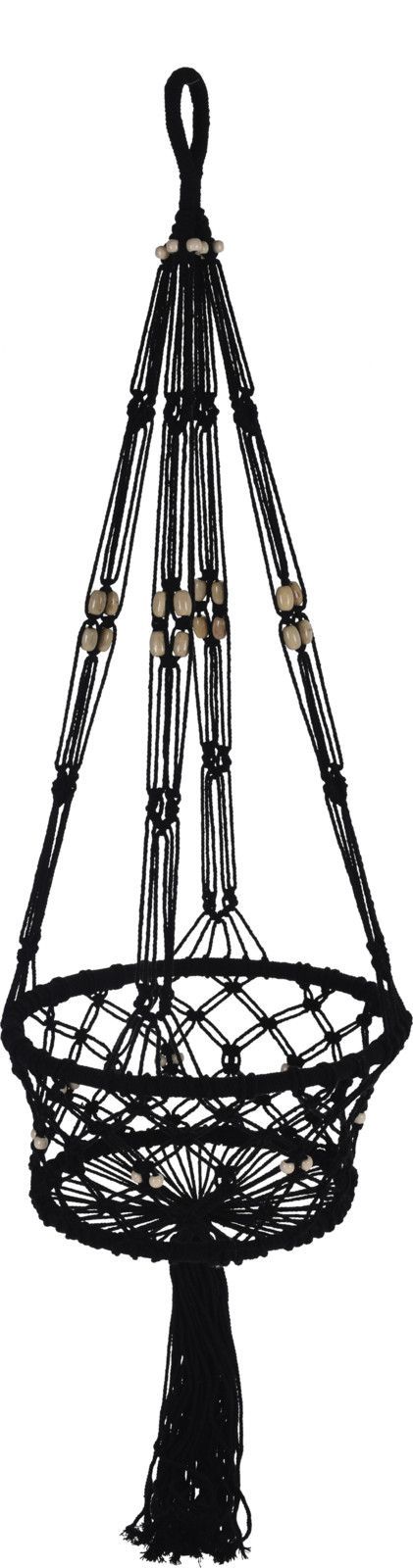 Vackert flätad makraméampel i svart rep.Inflätad ring i botten och i toppen och en rejäl upphängningsögla.Kombinera med lämplig kruka.