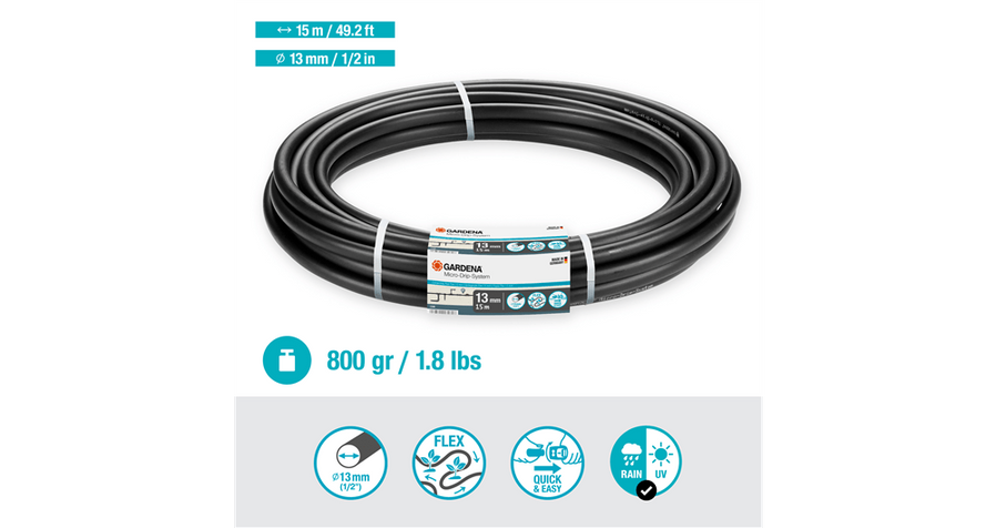GARDENA Anslutningsrör är den centrala matningslinjen i GARDENA Micro-Drip-Systemet. Den är UV-resistent och okänslig för ljus vilket säkerställer lång hållbarhet.