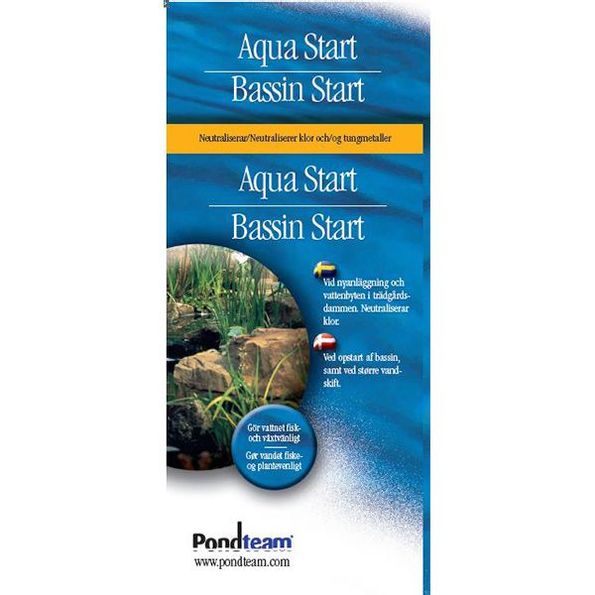 Aqua Start neutraliserar skadliga ämnen i kran och dammvatten. Innehåller också skyddskolloider som skyddar fiskens ömtåliga slemskikt. Medlet bör doseras enligt bruksanvisningen vid nyinredning och delvattenbyten. Aqua Start påverkar inte filter, växter och djur i dammen.