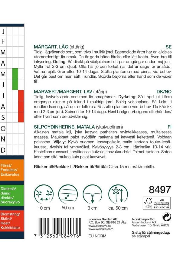 Tidig, lågväxande sort, som trivs i mullrik jord. Egna odlade ärtor har en alldeles utomordentligt fin smak. De är goda både färska eller lätt kokta. Även bra till infrysning.