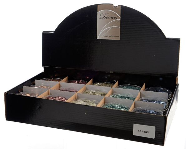 Ask med glitter i form av stjärnor, för dekoration och pyssel. Olika färger: brons, ljusrosa, pärlemo, antikgrön, blå. Storlek: 6mmx7.2gr