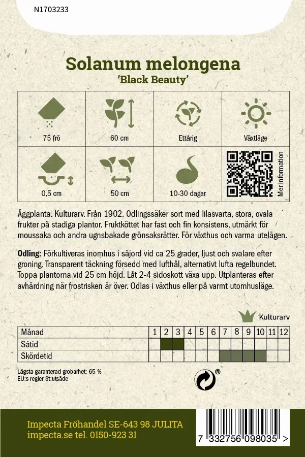 Kulturarv. Från 1902. Odlingssäker sort med lilasvarta, stora, ovala frukter på stadiga plantor. Fruktköttet har fast och fin konsistens, utmärkt för moussaka och andra ugnsbakade grönsaksrätter. För växthus och varma utelägen. Odling från frö: Förkultiveras inomhus i såjord vid ca 25 grader, ljust och svalare efter groning. Transparent täckning försedd med lufthål, alternativt lufta regelbundet. Toppa plantorna vid 25 cm höjd. Låt 2-4 sidoskott växa upp. Utplanteras efter avhärdning när frostrisken är över. Odlas i växthus eller på varmt utomhusläge. Portionsmängd: 75 frö Utvecklingstid, dagar: 60 Växtläge: sol Höjd: 60 cm Färg: Svart Såtid: feb-mars Grotid: 10-30 dagar Blomtid/Skördetid: juli-okt Årighet: Ettårig
