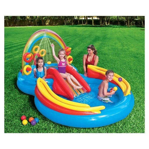 Med Intex Rainbow Ring i trädgården behöver du inte på semester i sommar! I den här färgstarka och mångsidiga barnpoolen kan dina barn njuta av oändliga ändamål. Poolen består av två bad, som är anslutna till varandra med hjälp av en vattenrutschbana.