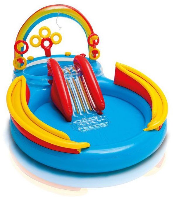 Med Intex Rainbow Ring i trädgården behöver du inte på semester i sommar! I den här färgstarka och mångsidiga barnpoolen kan dina barn njuta av oändliga ändamål. Poolen består av två bad, som är anslutna till varandra med hjälp av en vattenrutschbana.