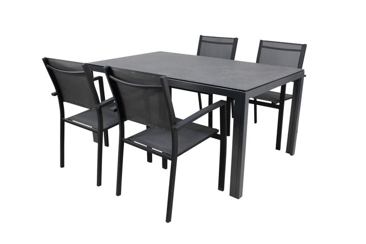 Snygg matbord tillverkat i antracitgrå pulverlackerad aluminium, med bordstopp i 8 mm härdatglas med spraystone topp.