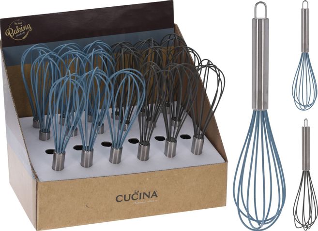 Ballongvisp i silikon med handtag i rostfritt stål. Flexibel ballongvisp med silikontrådar som är skonsamma mot non-stick-beläggning.