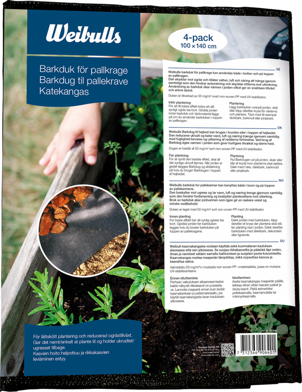 Barkduk mot ogräs i pallkragen – lägg i botten eller på toppen. Gör hål för plantorna och täck med tex täckbark. Släpper igenom luft, vatten och näring men stänger ute ljus. Jorden andas, värme och fuktighet bevaras så rotuttorkning och avdunstning hindras.