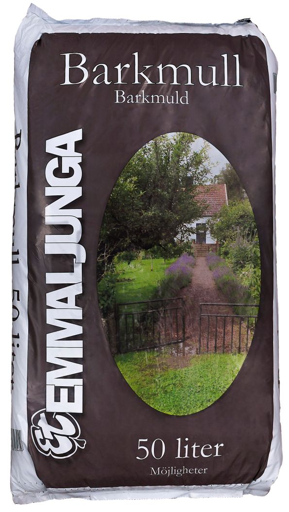 Barkmull 50 liter. Emmaljunga barkmull är en långtidskomposterad och finstrukturerad barrträdsbark. Barken är utmärkt som jordförbättring av leriga jordar, och mot frostskador vintertid. Funkar även som marktäckare och ogrästäckning. Använd ett lager av 7-8 cm barkmull det första året, vart efter 2-3 cm räcker kommande år.