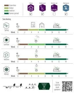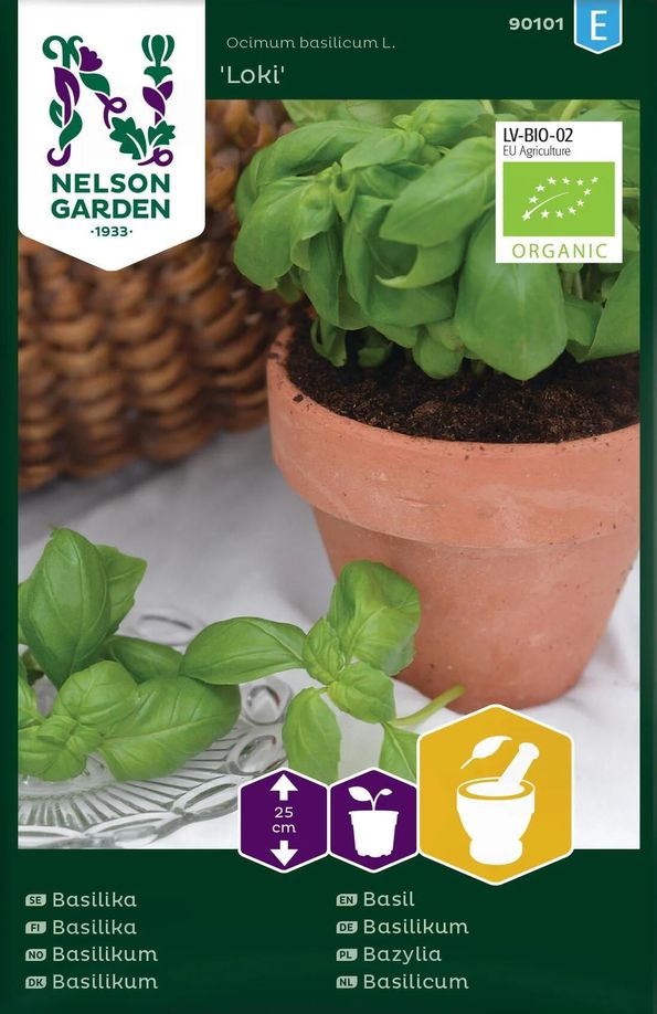 Ekologiskt frö. Basilika är en dekorativ och aromatisk krydda som älskar värme. Odla gärna basilika i kruka på en varm och solig plats. Bladen som skördas efter hand passar utmärkt till en ljuvlig pesto eller tillsammans med tomater och lite hyvlad parmesan. Vår – Spring Förodla plantor under våren. Så glest i såjord. Sätt 3-4 planta/kruka i gödslad jord när de är stora nog att hantera. Ställ ut krukan när lägsta nattemperatur är över 15°C eller behåll krukan i köket. Använd växtbelysning vid tidig sådd. Sommar – Summer Förodla plantor under sommaren. Inne eller i krukor ute. Så glest i såjord. Sätt 3-4 planta/kruka i gödslad jord när de är stora nog att hantera. Höst – Autumn Så inne i krukor för plock av blad under hösten. Behöver växtbelysning. Vinter – Winter Så inne i krukor för plock av blad under vintern. Behöver växtbelysning. Odlingsanvisning Räcker till: 30. plantor Växtläge: Sol Plantavstånd: 25 cm Radavstånd: 25 cm Sådjup: 0,2 cm Förodling: februari – maj Skördetid: april – oktober