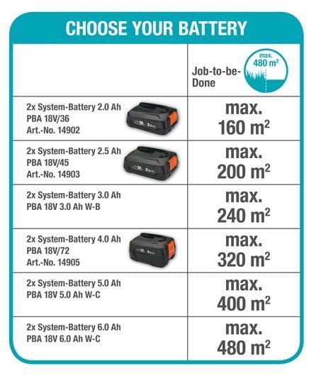 GARDENA Batteridriven gräsklippare PowerMax™ 32/36V P4A solo levereras utan batterier och laddare. Två 18 V-batterier krävs. Den är kompatibel med alla 18 V-batterisystem från POWER FOR ALL ALLIANCE, ett av de största batterisamarbetena med världsomspännande ledande tillverkare. Beroende på vilket batteri som väljs kan gräsklipparen klippa upp till 480 m² gräsmatta. Dessa batterier kan användas i många enheter i hemmet och trädgården. Du sparar alltså pengar och förblir flexibel! Föredrar du att köpa produkten med batterisystemet? Inga problem – då är det bruksfärdiga setet rätt val för dig.