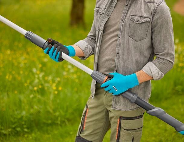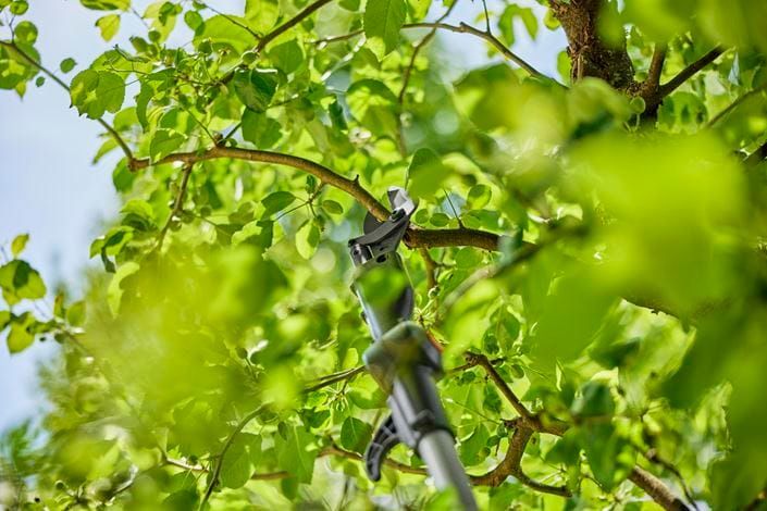Batteridriven teleskopisk Stångsax 250/18V P4A Komplett Set från GARDENA hjälper dig att enkelt beskära på höga höjder från marken. Den teleskopiska stångsaxen når en längd på upp till 2,5 meter och gör att du totalt kan nå upp till 4 meter vid beskärning. Tack vare den avtagbara axeln är teleskopiska stångsaxen lätt att transportera och förvara.