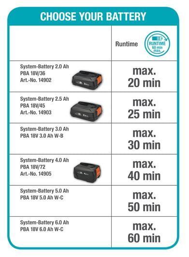 GARDENA HandyMower 22/18V P4A solo levereras utan batteri och laddare. Ett 18 V-batteri krävs. Den är kompatibel med alla 18 V-batterisystem från POWER FOR ALL ALLIANCE, ett av de största batterisamarbetena med världsomspännande ledande tillverkare. Beroende på vilket batteri som väljs kan gräsklipparen nå en körtid på upp till 60 minuter. Dessa batterier kan användas i många enheter i hemmet och trädgården. Du sparar alltså pengar och förblir flexibel! Föredrar du att köpa produkten med batterisystemet? Inga problem – då är det bruksfärdiga setet rätt val för dig.