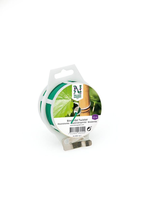 Plastöverdragen metalltråd för mjuk uppbindning. På rulle med avbitare. Grön. 50 m.