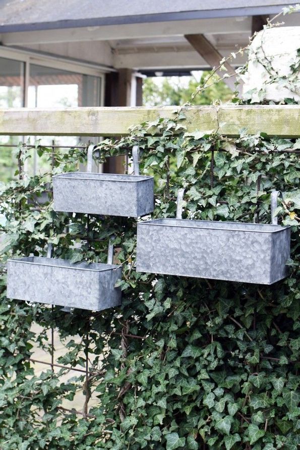 Balkonglåda med krokar i grå snygg metall.