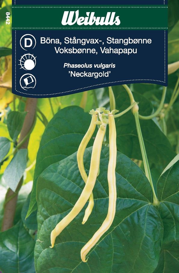 Störvaxböna med mjälla, runda gula baljor med utmärkt kvalitét och smak. Sorten är mycket rikgivande och baljorna skördas ca 23-25 cm långa. Föredrar en solig växtplats och näringsrik jord. Ge plantorna klätterstöd i form av långa störar eller spaljé. God lätt kokta eller i stuvningar. Utmärkt sort för infrysning. Odling: Så på friland i maj-juni då jordtemperaturen nått över 10 grader. Blötlägg eventuellt fröet över natten före sådd, så underlättas groningen. Gror efter 7-10 dagar. Stöd sedan plantorna med långa stöttor, ca 2 meter, så att de får mest möjliga ljus. Neckargold är resistent mot mosaikvirus. Mer information Såperiod: Maj-Juni Växtsätt: Fristående Höjd: 200 cm Växtavstånd: 15 cm Planteringsdjup: 1 cm Namn: Phaseolus vulgaris Periodskörd: Aug-Okt Räcker till: Ca. 40 plantor Färg: Gul