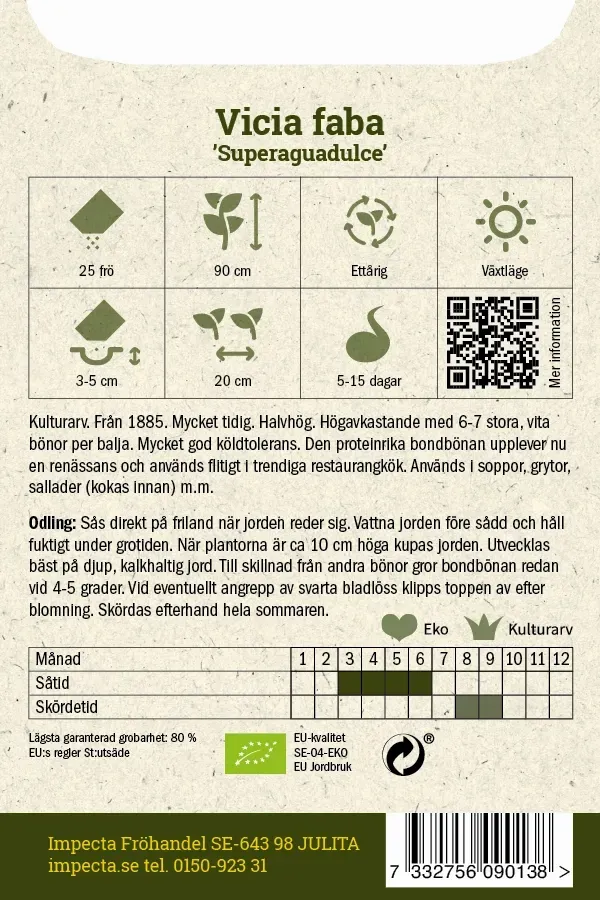 Kulturarv. Från 1885. Mycket tidig. Halvhög. Högavkastande med 6-7 stora, vita bönor per balja. Mycket god köldtolerans. Den proteinrika bondbönan upplever nu en renässans och används flitigt i trendiga restaurangkök och det finns många spännande recept där bondbönan ingår.