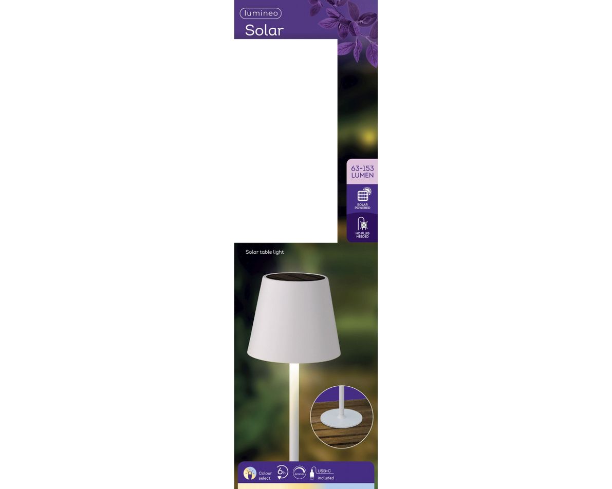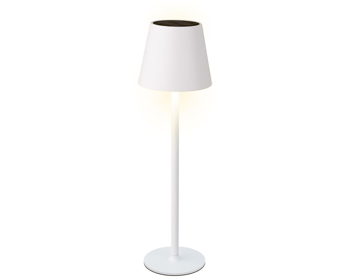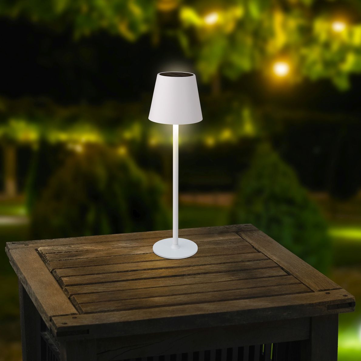 Vit bordslampa i metall med LED som drivs med solcell. Perfekt för både resturanger och uteplatser.