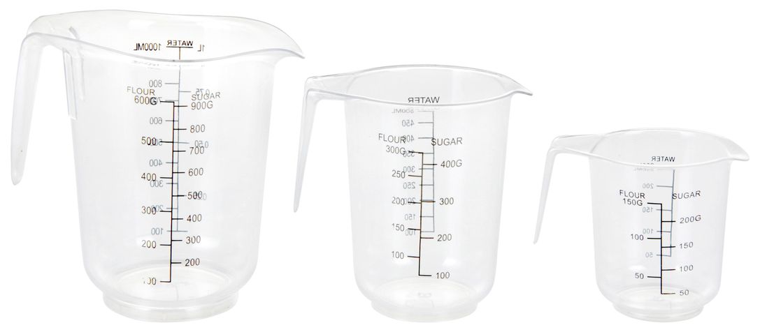 Mått: 1, 1/2 och 1/4 liter.