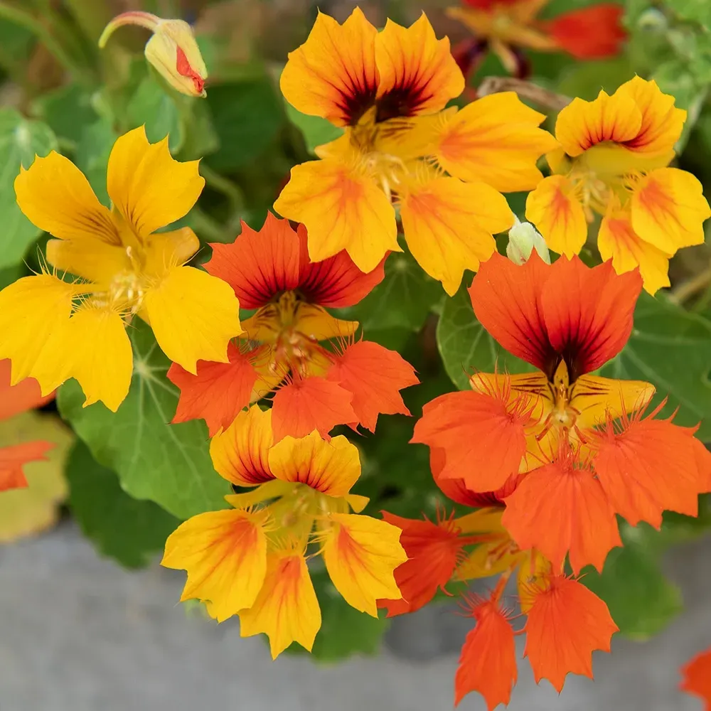 Annorlunda indiankrasse med tandade och flikiga blommor i eldig färgskala, från scharlakansrött till apelsin- och solgult i varierande teckning. Halvlånga rankor för amplar, lådor och kanter. Blommor och blad är ätliga och kan användas i sallader, som dekoration m.m.