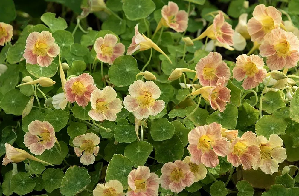 Vaniljgula blommor med körsbärsröd rodnad i skiftande teckning över ett klargrönt bladverk. Mycket rikblommande. Halvlånga rankor för amplar, lådor och kanter. Blommor och blad är ätliga och kan användas i sallader, som dekoration m.m.