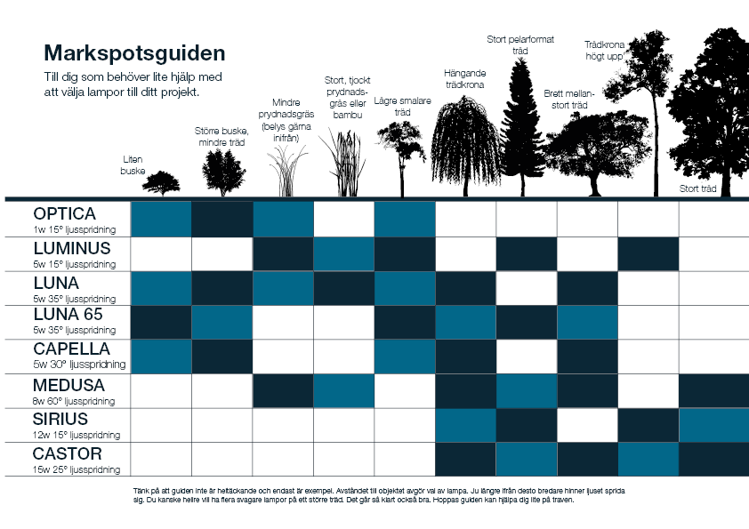 Castor är en kraftfull in-ground markspot som lyser upp riktigt stora träd, exempelvis ädellövträd. In-ground markspotar används ofta i den offentliga miljön, som i parker och andra platser där man vistas mycket. I en trädgård är huvudsyftet oftast att undvika gräsklipparen och snubbelrisken för exempelvis lekande barn, men också att undvika att se själva lampan.