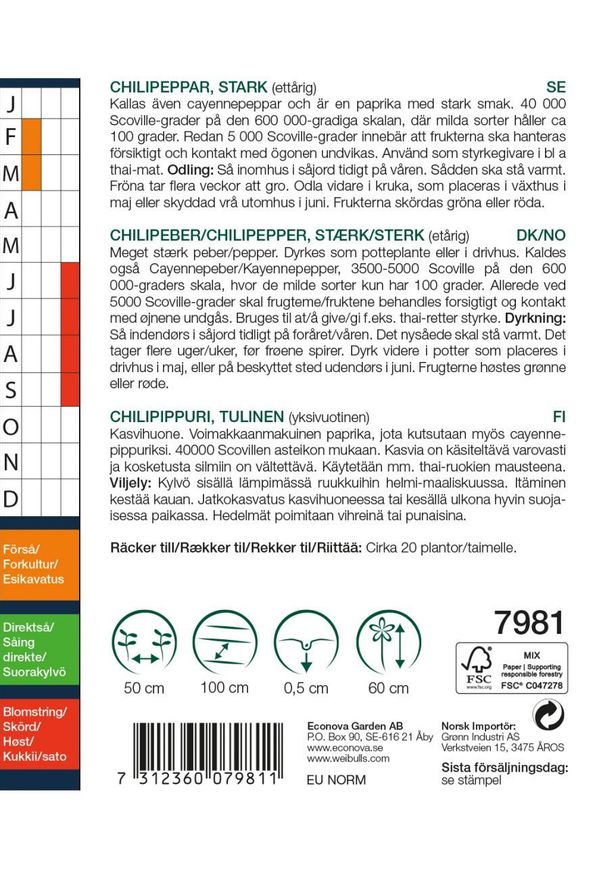 Så inomhus i såjord tidigt på våren. Sådden ska stå varmt. Fröna tar flera veckor på sig att gro. Odla vidare i rymlig kruka, som placeras i växthus i maj och framåt, eller placeras i skyddat, soligt läge utomhus när risken för frost är över. Frukterna skördas gröna eller röda. På hösten kan plantor lyftas in för odling och skörd inomhus. Beskär eventuellt plantan efter skörd. Vinterförvaras med ljus och sval placering för övervintring. Smakstyrka: Ca 40 000 Scoville