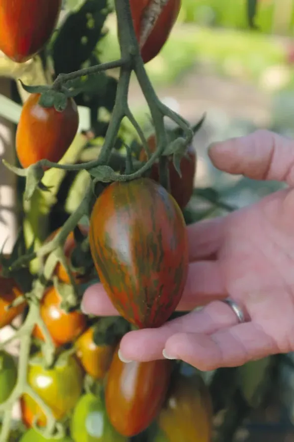 Tomaterna på 'Shimmer' F1 har ett lite annorlunda utseende med sin vackra avlånga plommonform som avslutas i en spets. Färgen sticker ut, som omogen är tomaten ljust grön med mörkgröna strimmor. Vid mognad övergår den till att få en brunröd bas som täcks av guldgröna strimmor. Smaken har fått bra betyg i smaktester, den är söt och saftig, frukten är mjuk. 'Shimmer' F1 är högavkastande och står emot sjukdomar och röta väl. En lättodlad tomatsort! Plantan blir hög och behöver växtstöd. Nyp bort tjuvarna regelbundet, det vill säga ta bort de små skotten som utvecklas i plantans bladveck. De stjäl energi ifrån huvudplantan. Cocktailtomat 'Shimmer' F1 har fördelen att se exotisk ut i färg och form, men samtidigt vara väldigt lättodlad. Smaken är god och när den trivs kan en planta producera upp till 300–350 frukter på en säsong. Det är så mycket att det räcker till grannarna också! Tomatklasarna är vackra då hela spektrumet är med, från de omogna gröna till de mogna brunröd-guldiga, allt på samma klase. Storleken på tomaterna är behändig, större än en körsbärstomat och mindre än en 'vanlig' tomat. Perfekt snack-storlek att äta direkt från plantan. En bra sort att använda för att ge en sallad ett lyxigt utseende. Odla 'Shimmer' F1 utomhus på friland i skyddat läge. Egenskaper Latinskt namn: Solanum lycopersicum Plantans höjd: 150-200 cm Kännetecken: Utomhus Såmetod: Förodling Färg: Rödstrimmig Mer information Växtläge: Sol Plantavstånd: 50 cm Radavstånd: 70 cm Sådjup: 0.5 cm Förodling: mars – april Skördetid: juli – september Räcker till: 3-4 plantor Förodling Använd såjord till fröna och håll sådden fuktig. Täck gärna sådden med plast eller ställ i minidrivhus så håller sig jorden fuktig längre. Den optimala såtemperaturen är 18-21°C. När plantorna tittat upp, ställ dem på en ljus och svalare plats för att få knubbiga och välmående plantor. Använd gärna extrabelysning, det förhindrar att plantorna blir långa och gängliga. När plantorna kan hanteras och har fått sina första karaktärsblad (bladpar nummer två) är det dags att plantera om dem i en lite större kruka. Vänta inte för länge med omplanteringen, det är nu de behöver en mer gödslad jord för att klara av en kraftig tillväxt. Sätt en planta i en 7 till 10 centimeter stor kruka fylld med gödslad jord (till exempel blomjord). Små plantor är känsliga och vid omplantering mår de bäst av att hanteras genom att hålla i bladen och inte i stjälken. Eftersom tomater kan bilda nya rötter längs med hela stjälken kan plantorna sättas djupt i nya krukan, då stimuleras tillväxt av nya rötter. Vid utplantering, vänta tills lägsta nattemp är +8°C. Eventuellt kan plantorna behöva en extra omplantering innan de sätts på sin slutgiltiga växtplats.