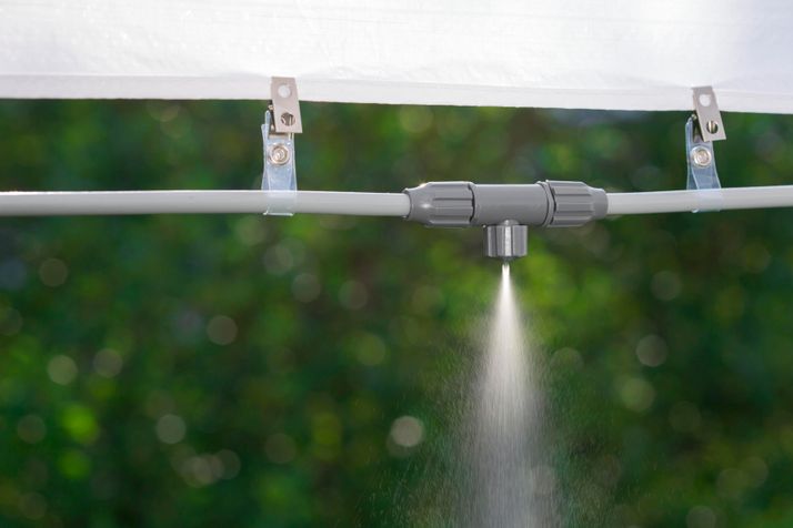 - Användning: Cooling Mist-setet för utomhusbruk ger en kylande effekt utomhus under varma sommardagar. Micro-Mist-munstycken sprider en fin vattendimma och kyler temperaturer med upp till 6°C. Den kan enkelt installeras på balkonger, terrasser, under parasoller och i tält. Systemet är anslutet till kranen med en integrerad OGS-slangkoppling.