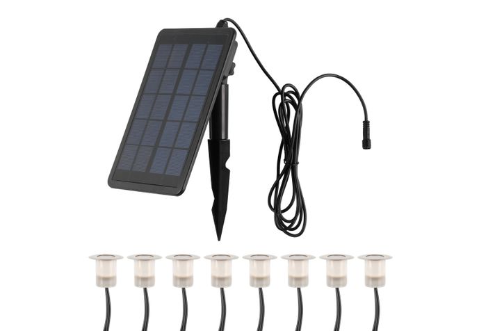 Högkvalitativ solcellsset med åtta spotlights. Armaturerna laddas med den medföljande solpanelen eller alternativt kan laddningen göras från USB-kontakten. Solpanelen har en skymningssensor som tänder belysningen när det blir mörkt och belysningen släcks automatiskt efter 7 timmars användning. Tre olika ljusutgångar kan väljas från solpanelsomkopplaren. Solpanelen är utrustad med en markspets. Kabellängderna mellan armaturerna är 1,6 m och kabeln mellan den första armaturen och solpanelen är 2,8 m. Solpanel: polykristallin 3 W 5 V 600 mAh. Batteri: 3,7 V 2000mAh Li. Kapslingsklass IP68. Ljuseffekt max 25 lm/armatur. Effekt: 3 W/set. Storlek på solpanel: 13 cmx19,5 cmx0,6 cm. Färgtemperatur 4000 K (ljusvit). Garanti 12 månader.