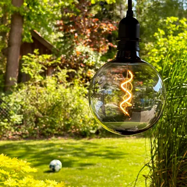Ljuskällan DecoXL (smoke) & den vävda tygsladden Gravity (150cm) blir till en vacker vädertålig pendellampa, perfekt för pergolan eller uteplatsen. Paketet innehåller en ljuskälla och en sladd.