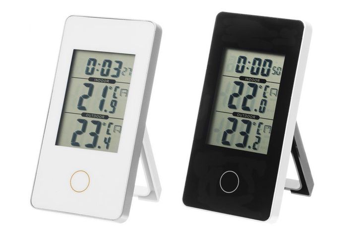 Digital termometer med modern design för inom- och utomhusbruk.