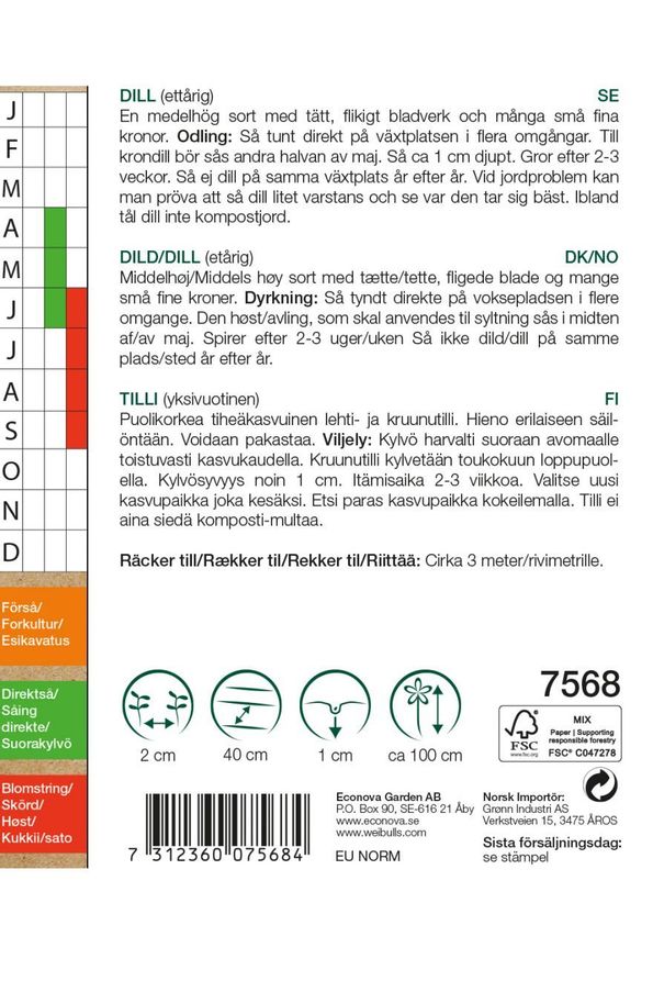 En medelhög sort med tätt, flikigt bladverk och många små fina kronor. Odling: Så tunt direkt på växtplatsen i flera omgångar. Till krondill bör sås andra halvan av maj. Så ca 1 cm djupt. Gror efter 2-3 veckor. Så ej dill på samma växtplats år efter år. Vid jordproblem kan man pröva att så dill litet varstans och se var den tar sig bäst. Ibland tål dill inte kompostjord. Mer information Artikel nr: 7568 Såperiod: April-Juni Växtsätt: Fristående Höjd: 100 cm Växtavstånd: 2 cm Radavstånd: 40 cm Planteringsdjup: 1 cm Namn: Anethum graveolens Periodskörd: Juni-Sep Krav: Ja Räcker till: Ca. 3 mtr.
