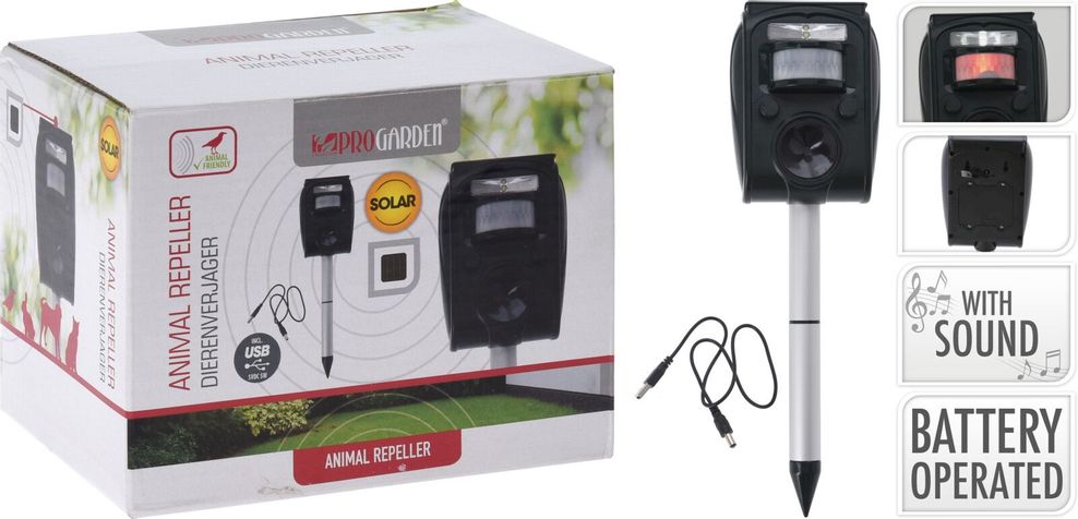 Den avger ljud som ska avskäcka såväl grannens katt, som gnagare och fåglar. USB-sladd medföljer.