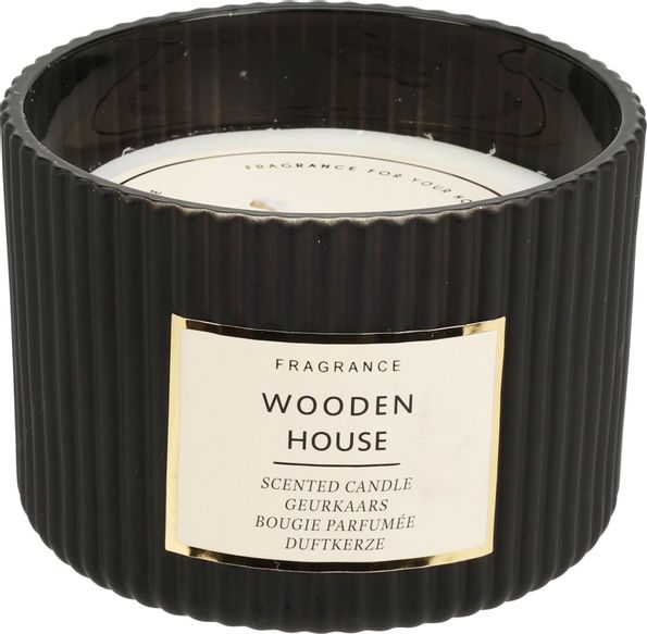 Doftljus i en svart räfflad behållare.
