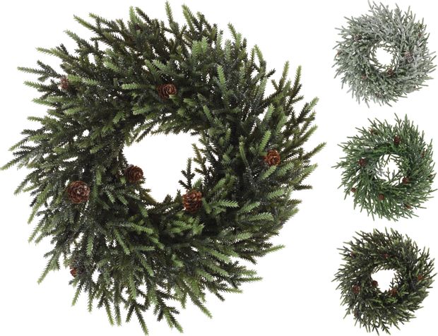 Dörrkrans tillverkad i konstgjorda barr med kottar.
