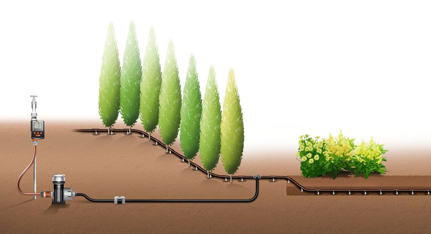 Droppbevattningsrad under och ovan jord med en diameter på 13,7 mm kan installeras under marken där den inte syns och är avsedd för bevattning av kantplacerade plantor och gräsytor. Avståndet mellan droppmunstyckena i röret är 30 cm, varje munstycke bevattnar 1,6 l/h.