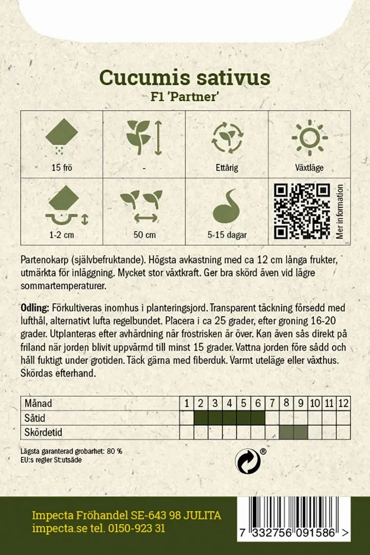 Partenokarp (självbefruktande). Högsta avkastning med ca 12 cm långa frukter, utmärkta för inläggning. Mycket stor växtkraft. Ger bra skörd även vid lägre sommartemperaturer.