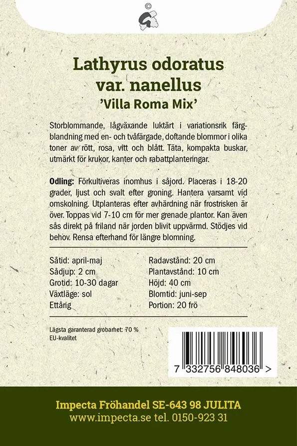 Toppas vid 7-10 cm för mer grenade plantor. Kan även sås direkt på friland när jorden blivit uppvärmd. Stödjes vid behov. Rensa efterhand för längre blomning.