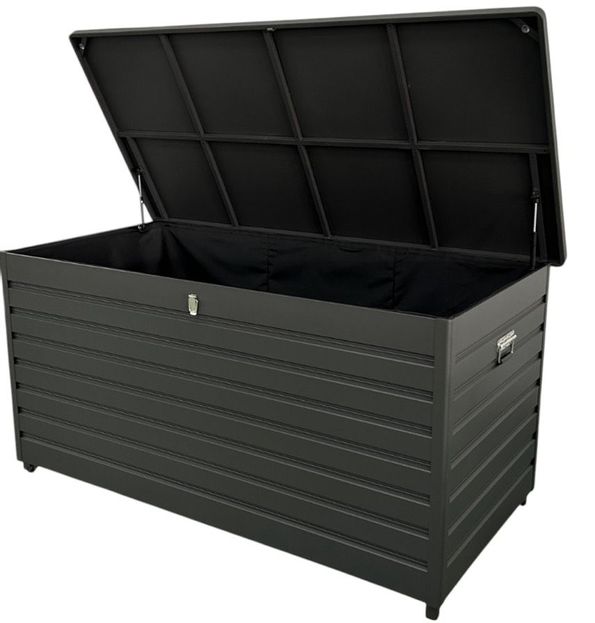 Rymlig förvaringslåda/dynbox i pulverlackarad svart aluminium.