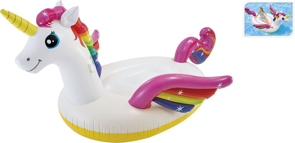 Stor uppblåsbar enhörning tillverkad i slitstark vinyl, med två handtag.