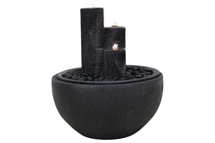 Vatten har en lugnande och avstressande inverkan på oss människor, framförallt att höra ett porlande från ett litet vattenspel eller fontän. Det enda kravet för vattenspel är tillgång till el för att pumpen ska fungera. I övrigt behövs egentligen bara vatten. Vattenspelet är tillverkat i stenimitation, tillverkad i glasfiber och natursten. Levereras komplett, med ledlampa och pump. Mycket enkel inkoppling. Drivs med 12 volt transformator. Slang och LED lampa är fördraget. Kabellängd 5 meter. Bör förvaras frostfritt under vintertid.