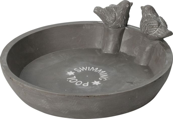 Fint fågelbad med två sittande fåglar. En vacker trädgårdsdetalj som både pryder och bjuder in till fågelbesök.