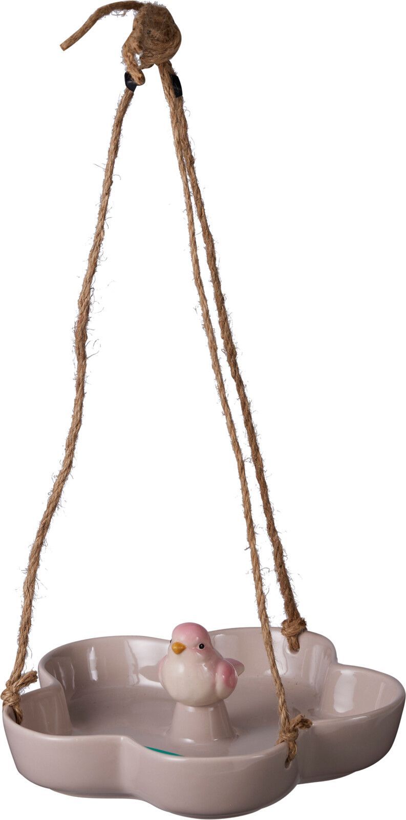 Fint fågelbad i porslin med praktiskt juteband för upphängning. En charmig detalj som lockar fåglar till trädgården samtidigt som det blir en dekorativ touch.