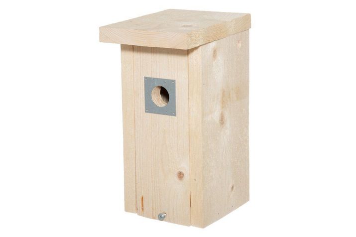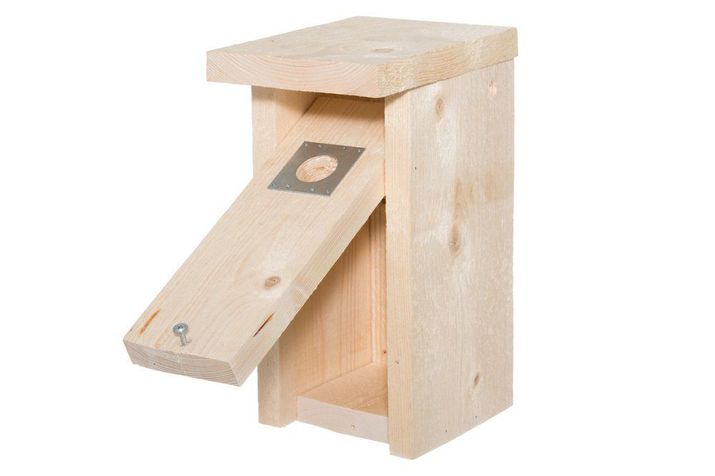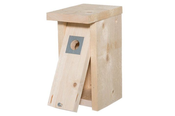 Fågelholk i obehandlat trä med en öppningsbar framsida.