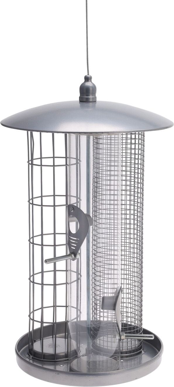 En fågelmatare med skyddsnät och små utfodringsportar som tillåter endast småfåglar att äta.