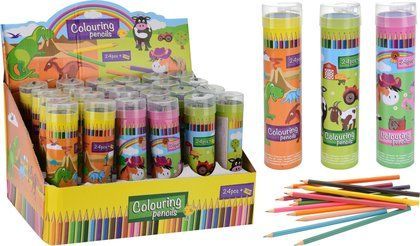 Färgpennor 24-pack i burk med pennvässare i locket.