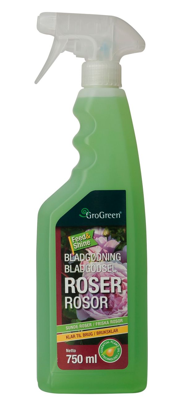 GroGreen Feed & Shine är miljövänligt och skonsamt mot rosor och natur. Användning: Sprutas på alla rosenblad tills vätskan droppar från bladen. Sprutas på torra blad och i torrväder. Används INTE i direkt solsken. Produkten används en gång per vecka från maj till september.