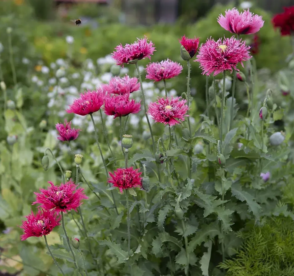 Stora, ljuvliga, körsbärsröda till hallonrosa, heldubbla blommor med täta, fransiga fjäderlika kronblad. Lättodlad sommarblomma för rabatt och sommaräng som utgör ett uppseendeväckande inslag även i buketter. Dekorativa frökapslar, vackra i torkade arrangemang. OBS! Växten är giftig.